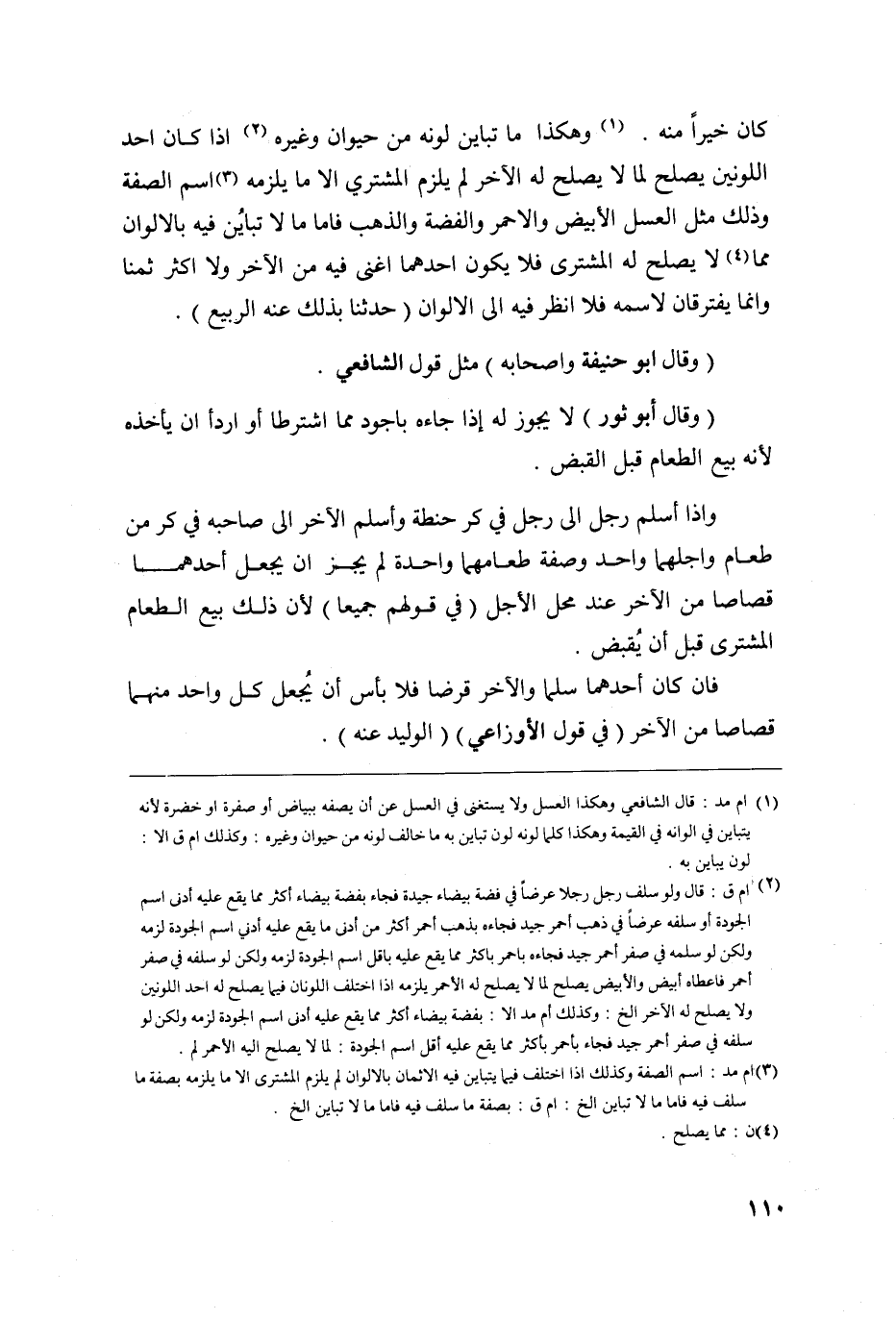 1 أم مد: قال الشافعي وهكذا العمل ولا يستغي في العسل عن أن يصفه ببياض أو صفرة أو خضرة لأنه يتباين في ألوانه في القيمة وهكذا كلما لونه لون تباين به ما