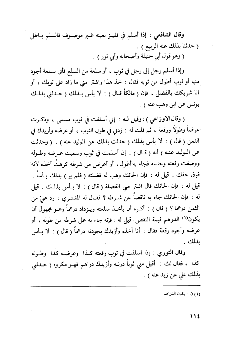 وقال الأوزاعي وقيل له إني أسلفت في ثوب مسمى وذكرت عرضا وطولا ورقعة ثم قلت له زدني في طول الثوب أو عرضه وأزيدك في الثمن قال لا بأس بذلك حدثت بذلك عن الوليد عنه وحدثت عن الوليد عنه أنه قال إن أسلمت في ثوب وسميت عرضه وطوله ووصفت رقعته وجنسه فجاء به أطول أو أعرض من شرطه كرهت أخذه لأنه فوق حقك قيل له فإن الحائك وهب له فضلته فلم ير بذلك بأسا قيل له فإن الحائك قال اشتر مني الفضلة قال لا بأس بذلك قيل له فإن الحائك جاء به ناقصا عن شرطه فقال له المشتري رد علي من الثمن درهما قال أكره أن يأخذ سلعته ويزداد درهما وهو مجهول أن يكون1 الدرهم قيمة النقص قيل له فإنه جاء به على شرطه من طوله أو عرضه وأجود رقعة فقال أنا آخذه وأزيدك بجودته درهما قال لا بأس بذلك.