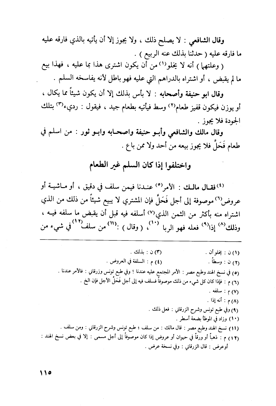 9 م: ذهبا أو في حيوان أو عروض إذا كان موصوفا إلي أجل مسمي: إلا في بعض نسخ الهند: أو عرض: قال الزرقاني: وفي نسخة عرض.