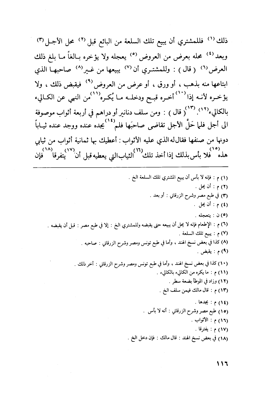 ذلك1 فللمشتري أن يبيع تلك السلعة من البائع قبل2 محل الأجل3 وبعد4 محله بعرض من العروض5 يعجله ولا يؤخره بالغا ما بلغ ذلك العرض6 قال وللمشتري أن7 يبيعها من غير8 صاحبها الذي ابتاعها منه بذهب أو ورق أو عرض من العروض9 فيقبض ذلك ولا يؤخره لأنه إذا10 أخره قبح ودخله ما يكره11 من النهي عن الكاليء بالكاليء12. 13قال ومن سلف دنانير أو دراهم في أربعة أثواب موصوفة إلى أجل فلما حل الأجل تقاضى صاحبها فلم14 يجده عنده ووجد عنده ثيابا دونها من صنفها فقال له الذي عليه الأثواب أعطيك بها ثمانية أثواب من ثيابي هذه15 فلا بأس بذلك إذا أخذ تلك16 الثياب التي يعطيه قبل أن17 يتفرقا18 فإن