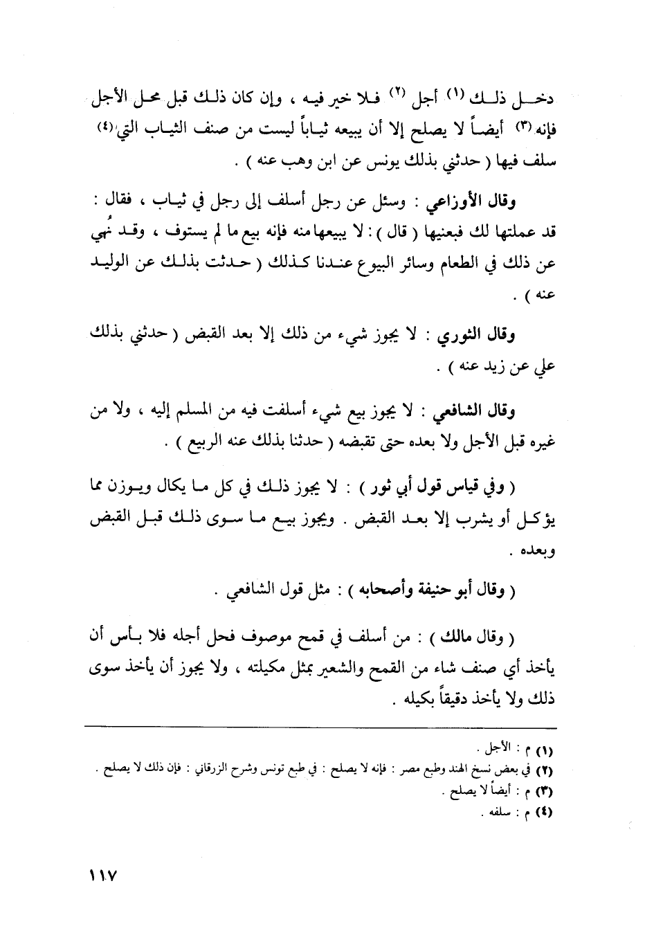 وقال الأوزاعي وسئل عن رجل أسلف إلى رجل في ثياب فقال قد عملتها لك فبعنيها قال لا يبيعها منه فإنه بيع ما لم يستوف وقد نهي عن ذلك في الطعام وسائر البيوع عندنا كذلك "حدثت بذلك عن الوليد عنه"