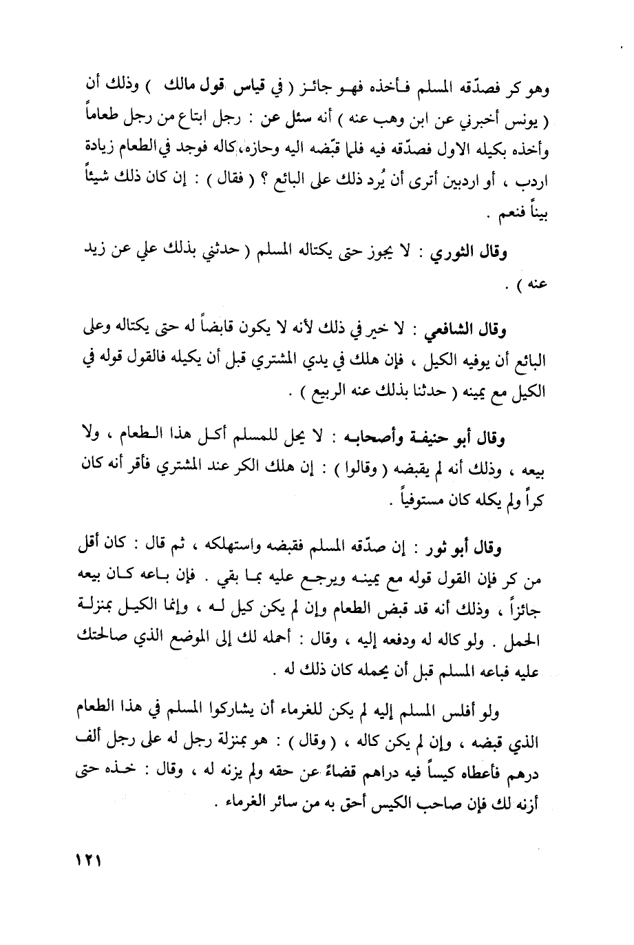 وقال أبو ثور إن صدقه المسلم فقبضه واستهلكه ثم قال كان أقل من كر فإن القول قوله مع يمينه ويرجع عليه بما بقي فإن باعه كان بيعه جائزا وذلك أنه قد قبض الطعام وإن لم يكن كيل له وإنما الكيل بمنزلة الحمل ولو كاله له ودفعه إليه وقال أحمله لك إلى الموضع الذي صالحتك عليه فباعه المسلم قبل أن يحمله كان ذلك له.