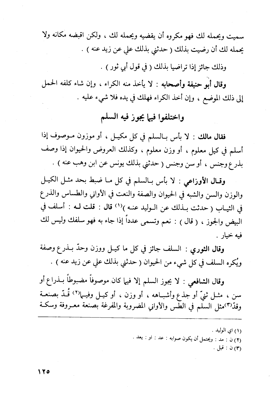 وقال الشافعي لا يجوز السلم إلا فيما كان موصوفا مضبوطا بذراع أو سن مثل ثني أو جذع وأشباهه أو وزن أو كيل وفيما2 قد بصنعة وقد3 مثل السلم في الطس والأواني المضروبة والمفرغة بصنعة معروفة وسكة