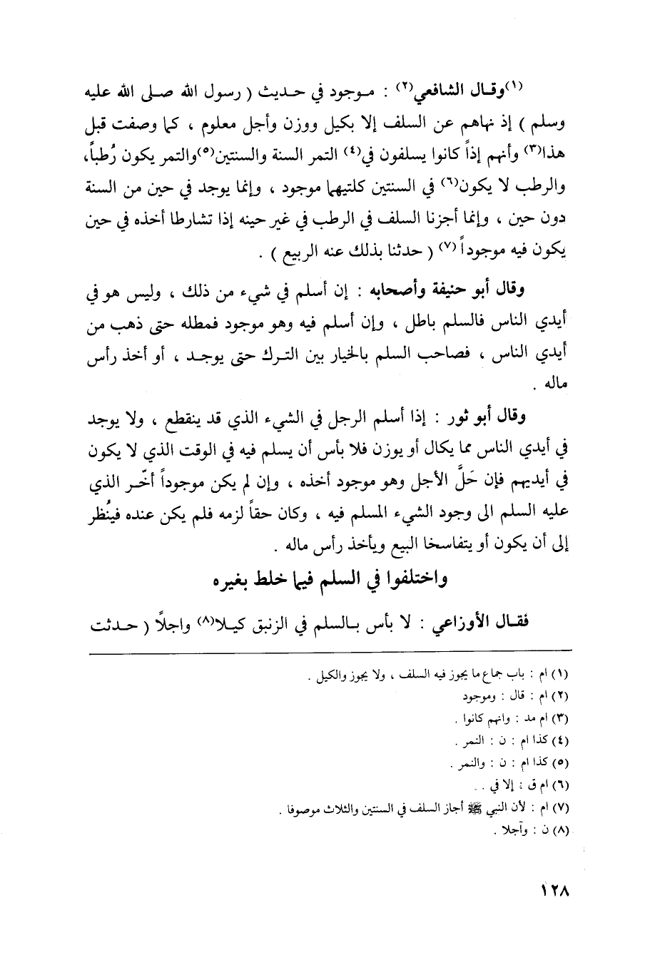 7 أم: لأن النبي صلي الله عليه وسلم أجاز السلف في السنتين والثلاث موصوفا.