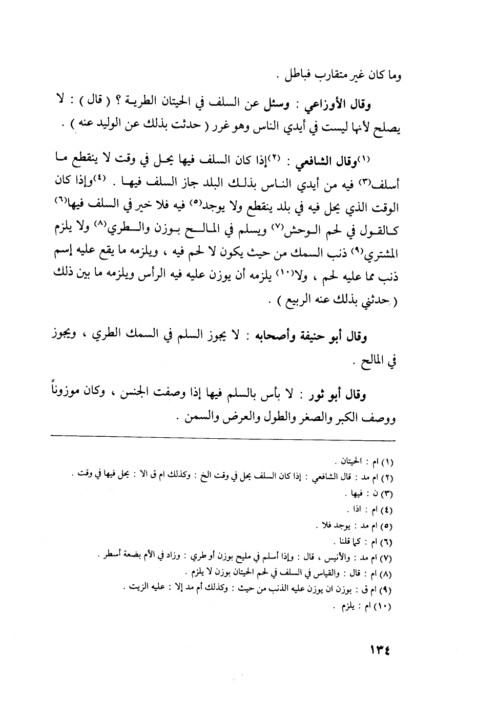 1وقال الشافعي:2 إذا كان السلف فيها يحل في وقت لا ينقطع ما أسلف3 فيه من أيدي الناس بذلك البلد جاز السلف فيها. 4وإذا كان الوقت الذي يحل فيه في بلد ينقطع ولا يوجد5 فيه فلا خير في السلف فيها6 كالقول في لحم الوحش7 ويسلم في المالح بوزن والطري8 ولا يلزم المشتري9 ذنب السمك من حيث يكون لا لحم فيه ويلزمه ما يقع عليه إسم ذنب مما عليه لحم ولا10 يلزمه أن يوزن عليه فيه الرأس ويلزمه ما بين ذلك "حدثني بذلك عنه الربيع".