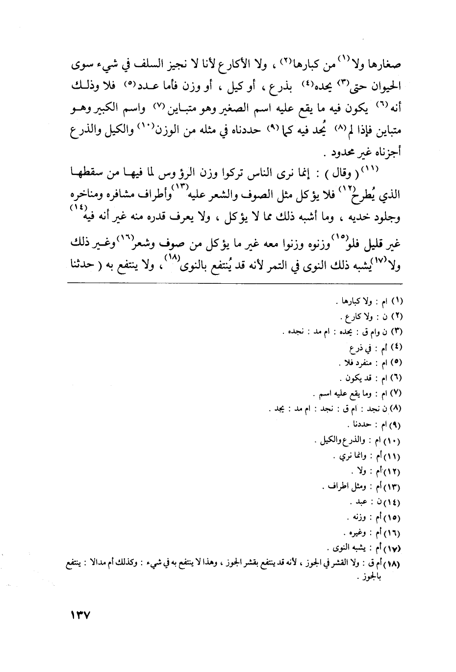 صغارها ولا1 من كبارها2 ولا الأكارع لأنا لا نجيز السلف في شيء سوى الحيوان حتى3 يحده4 بذرع أو كيل أو وزن فأما عدد5 فلا وذلك أنه6 يكون فيه ما يقع عليه اسم الصغير وهو متباين7 واسم الكبير وهو متباين فإذا لم8 يحد فيه كما9 حددناه في مثله من الوزن10 والكيل والذرع أجزناه غير محدود.