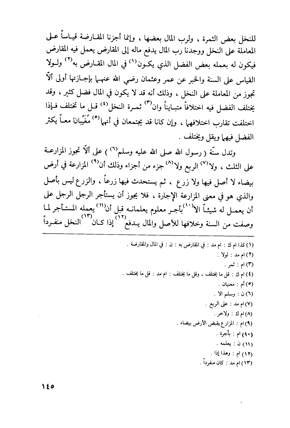 للنخل بعض الثمرة ولرب المال بعضها وإنما أجزنا المقارضة قياسا على المعاملة على النخل ووجدنا رب المال يدفع ماله إلى المقارض يعمل فيه المقارض فيكون له بعمله بعض الفضل الذي يكون1 في المال المقارض به2 ولولا القياس على السنة والخبر عن عمر وعثمان رضي الله عنهما بإجازتها أولى ألا تجوز من المعاملة على النخل وذلك أنه قد لا يكون في المال فضل كثير وقد يختلف الفضل فيه اختلافا متباينا وإن3 ثمرة النخل4 قل ما تختلف فإذا اختلفت تقارب اختلافهما وإن كانا قد يجتمعان في أنهما5 مغيبان معا يكثر الفضل فيهما ويقل ويختلف.