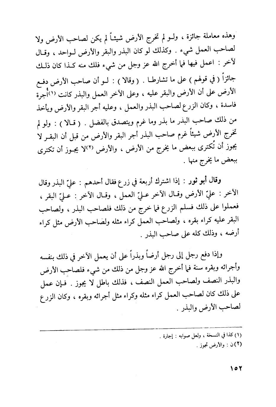وهذه معاملة جائزة ولو لم تخرج الأرض شيئا لم يكن لصاحب الأرض ولا لصاحب العمل شيء وكذلك لو كان البذر والبقر والأرض لواحد وقال لآخر اعمل فيها فما أخرج الله عز وجل من شيء فلك منه كذا كان ذلك جائزا في قولهم على ما تشارطا وقالا لو أن صاحب الأرض دفع الأرض على أن الأرض والبقر عليه وعلى الآخر العمل والبذر كانت 1أجرة فاسدة وكان الزرع لصاحب البذر والعمل وعليه أجر البقر والأرض ويأخذ من ذلك صاحب البذر ما بذر وما غرم ويتصدق بالفضل قالا ولو لم تخرج الأرض شيئا غرم صاحب البذر أجر البقر والأرض من قبل أن البقر لا يجوز أن تكترى ببعض ما يخرج من الأرض والأرض 2لا يجوز أن تكترى ببعض ما يخرج منها.