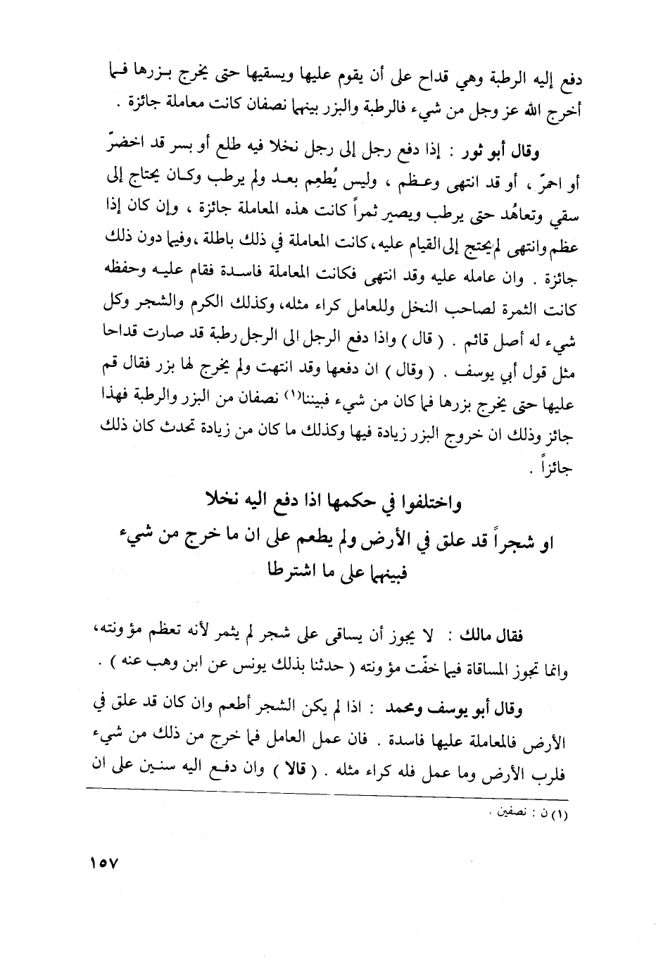 وقال أبو ثور إذا دفع رجل إلى رجل نخلا فيه طلع أو بسر قد اخضر أو احمر أو قد انتهى وعظم وليس يطعم بعد ولم يرطب وكان يحتاج إلى سقي وتعاهد حتى يرطب ويصير ثمرا كانت هذه المعاملة جائزة وإن كان إذا عظم وانتهى لم يحتج إلى القيام عليه كانت المعاملة في ذلك باطلة وفيما دون ذلك جائزة وان عامله عليه وقد انتهى فكانت المعاملة فاسدة فقام عليه وحفظه كانت الثمرة لصاحب النخل وللعامل كراء مثله وكذلك الكرم والشجر وكل شيء له أصل قائم قال وإذا دفع الرجل إلى الرجل رطبة قد صارت قداحا مثل قول أبي يوسف وقال إن دفعها وقد انتهت ولم يخرج لها بزر فقال قم عليها حتى يخرج بزرها فما كان من شيء فبيننا1 نصفان من البزر والرطبة فهذا جائز وذلك إن خروج البزر زيادة فيها وكذلك ما كان من زيادة تحدث كان ذلك جائزا.