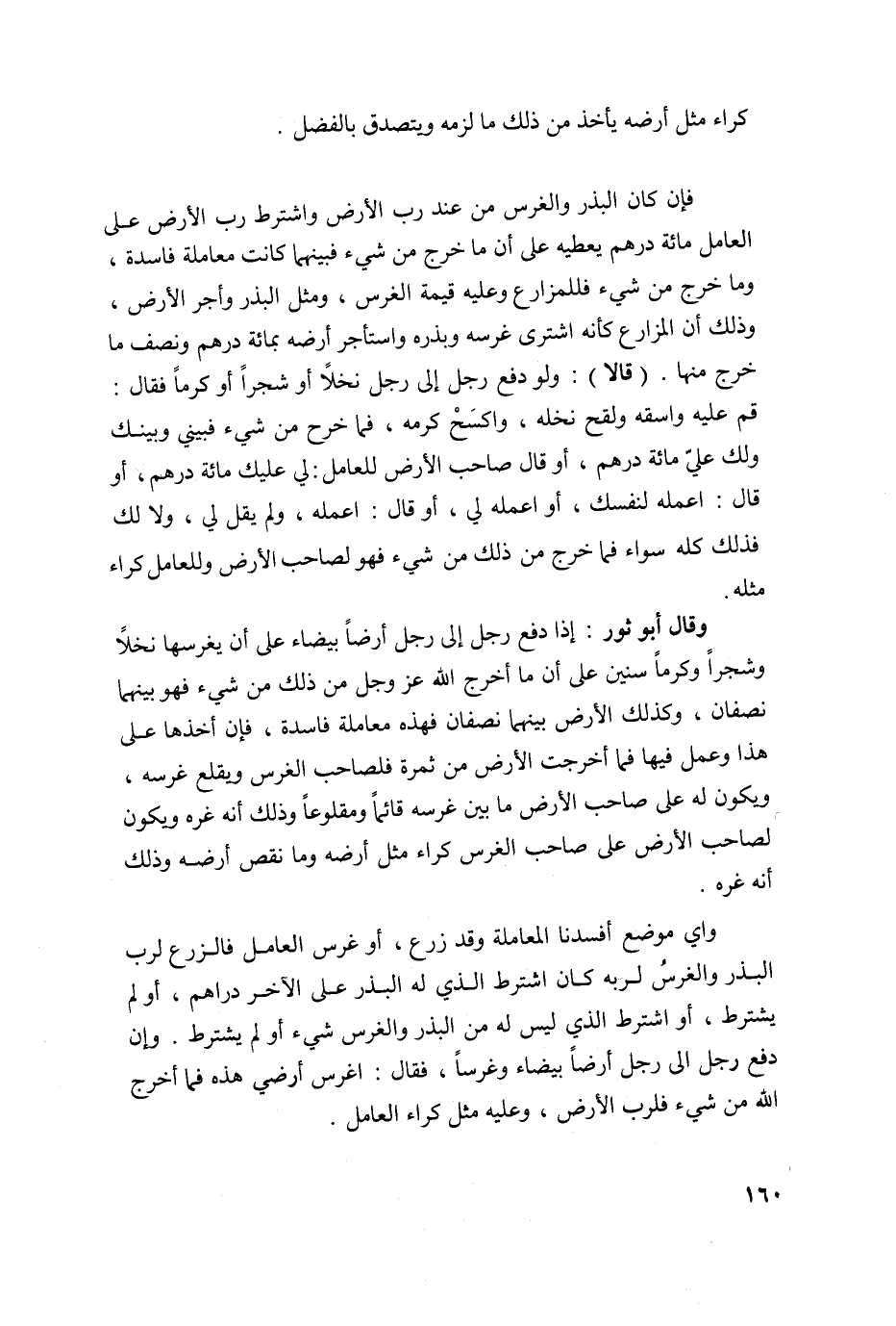 فإن كان البذر والغرس من عند رب الأرض واشترط رب الأرض على العامل مائة درهم يعطيه على أن ما خرج من شيء فبينهما كانت معاملة فاسدة وما خرج من شيء فللمزارع وعليه قيمة الغرس ومثل البذر وأجر الأرض وذلك أن المزارع كأنه اشترى غرسه وبذره واستأجر أرضه بمائة درهم ونصف ما خرج منها قالا ولو دفع رجل إلى رجل نخلا أو شجرا أو كرما فقال قم عليه واسقه ولقح نخله واكسح كرمه فما خرج من شيء فبيني وبينك ولك علي مائة درهم أو قال صاحب الأرض للعامل لي عليك مائة درهم أو قال اعمله لنفسك أو اعمله لي أو قال اعمله ولم يقل لي ولا لك فذلك كله سواء فما خرج من ذلك من شيء فهو لصاحب الأرض وللعامل كراء مثله.