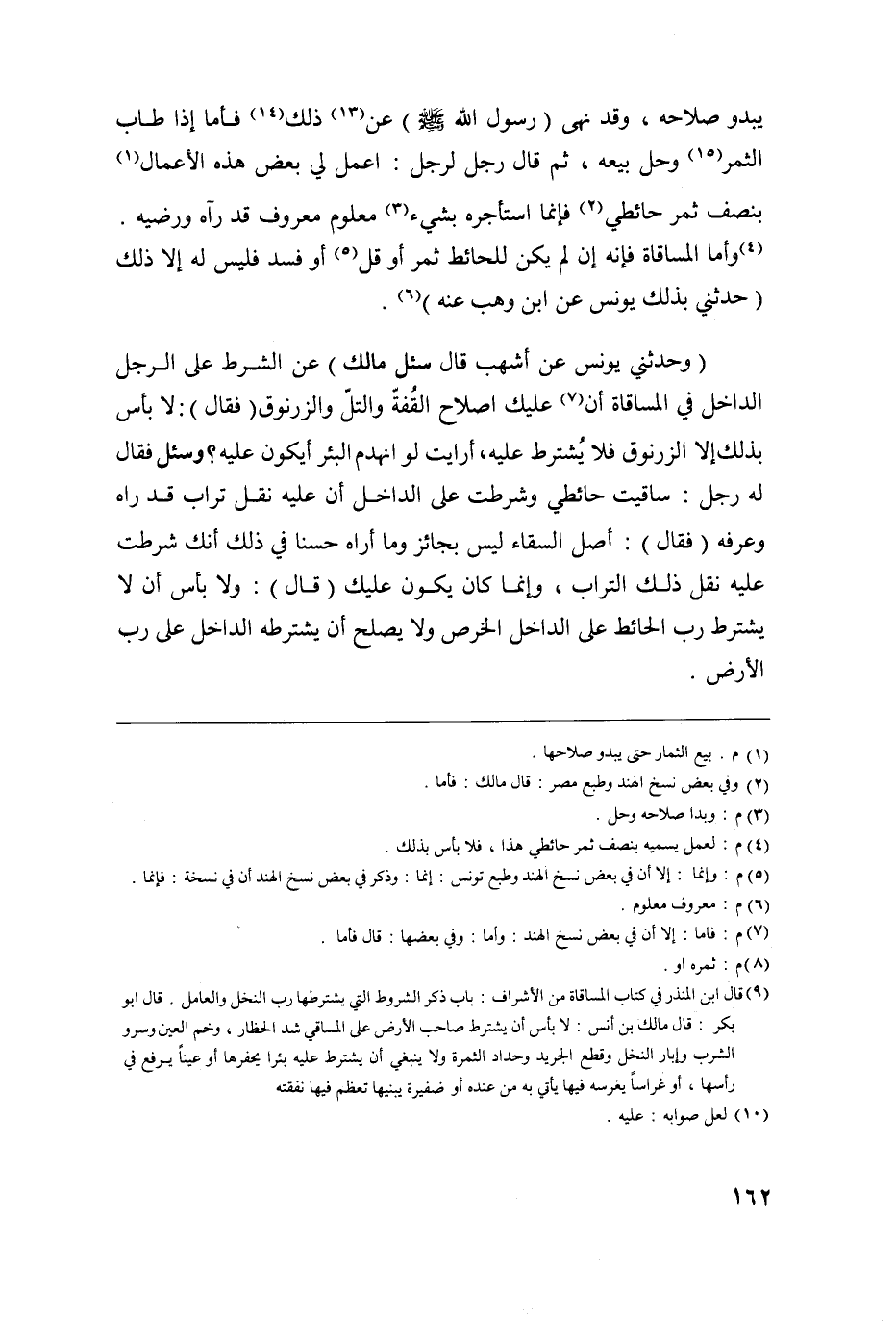 9 قال ابن المنذر في كتاب المساقاة من الأشراف: باب ذكر الشروط التي يشترطها رب النخل والعامل. قال أبو بكر: قال مالك بن أنس لا بأس أن يشترط صاحب الأرض علي المساقي شد الحظار وخم العين وسرو الشرب وإبار النخل وقطع الجريد وحداد الثمرة ولا ينبغي أن يشترط عليه بئرا يحفرها أو عينا يرفع في رأسها أو غرسا فيها يأتي به أو ضفيرة يبنيها تعظم فيها نفقته.