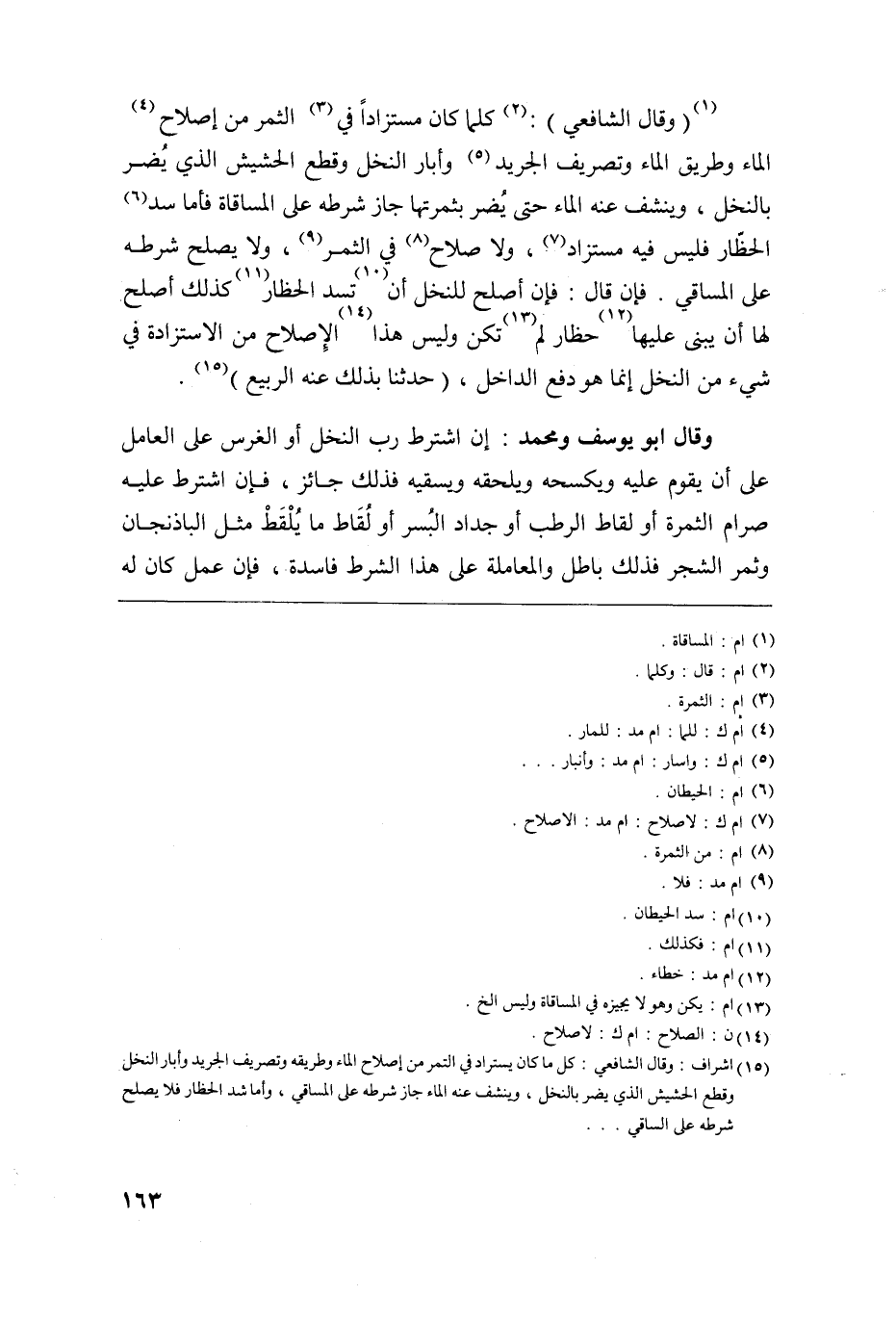 15 أشراف: وقال الشافعي: كل ما كان يستراد في التمر من صلاح الماء وطريقه وتصريف الجريد وأبار النخل وقطع الحشيش الذي يضر بالنخل وينشف عنه الماء جاز شرطه علي المساقي وأما شد الحظار فلا يصلح شرطه علي المساقي.