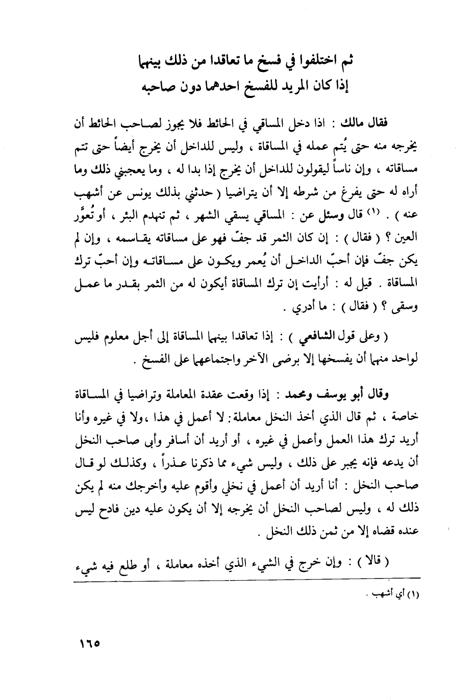 وعلى قول الشافعي إذا تعاقدا بينهما المساقاة إلى أجل معلوم فليس لواحد منهما أن يفسخها إلا برضى الآخر واجتماعهما على الفسخ.