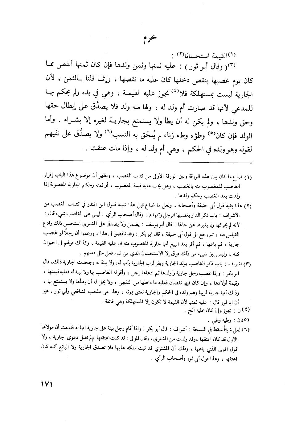1 ضاع ما كان بينةهذه الورقة وبين الورقة الأولي من كتاب الغصب ويظهر أن موضوع هذا الباب إقرار الغاصب للمغصوب منه بالغصب وهل يجب عليه قيمة المغصوب أو ثمنه وحكم الجارية المغصوبة إذا ولدت بعد الغصب وحكم ولدها.