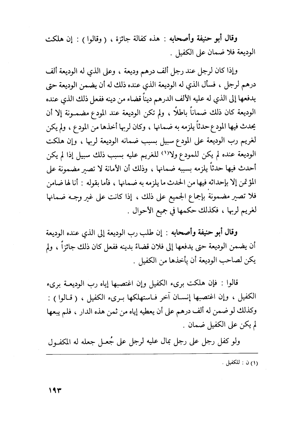 وقال أبو حنيفة وأصحابه هذه كفالة جائزة وقالوا إن هلكت الوديعة فلا ضمان على الكفيل.