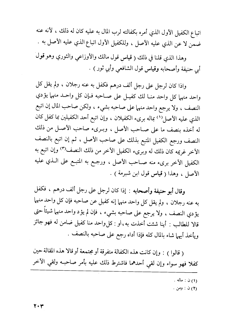 وإذا كان لرجل على رجل ألف درهم فكفل به عنه رجلان ولم يقل كل واحد منهما كل واحد منا لك كفيل على صاحبه فإن كل واحد منهما يؤدي النصف ولا يرجع واحد منهما على صاحبه بشيء ولكن صاحب المال إن اتبع الذي عليه الأصل1 بماله برئ الكفيلان وإن اتبع أحد الكفيلين بما كفل كان له أخذه بنصف ما على صاحب الأصل وبرئ صاحب الأصل من ذلك النصف ورجع الكفيل المتبع بذلك على صاحب الأصل ثم إن اتبع بالنصف الآخر غريمه كان ذلك له وبرئ الكفيل الآخر من ذلك النصف2 وإن اتبع به الكفيل الآخر برئ منه صاحب الأصل ورجع به المتبع على الذي عليه الأصل وهذا قياس قول ابن شبرمة.