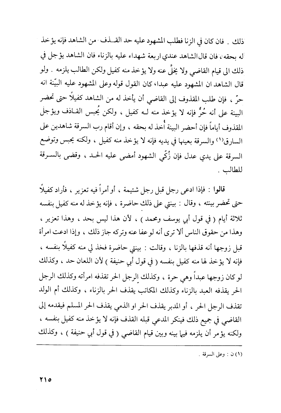 ذلك فان كان في الزنا فطلب المشهود عليه حد القذف من الشاهد فإنه يؤخذ له بحقه فان قال الشاهد عندي أربعة شهداء عليه بالزناء فان الشاهد يؤجل في ذلك إلى قيام القاضي ولا يخلى عنه ولا يؤخذ منه كفيل ولكن الطالب يلزمه ولو قال الشاهد ان المشهود عليه عبدا كان القول قوله وعلى المشهود عليه البينة انه حر فإن طلب المقذوف إلى القاضي أن يأخذ له من الشاهد كفيلا حتى تحضر البينة على أنه حر فإنه لا يؤخذ منه له كفيل ولكن يحبس القاذف ويؤجل المقذوف أياما فإن أحضر البينة أخذ له بحقه وإن أقام رب السرقة شاهدين على السارق1 والسرقة بعينها في يديه فإنه لا يؤخذ منه كفيل ولكنه يحبس وتوضع السرقة على يدي عدل فإن زكي الشهود أمضى عليه الحد وقضى بالسرقة للطالب.