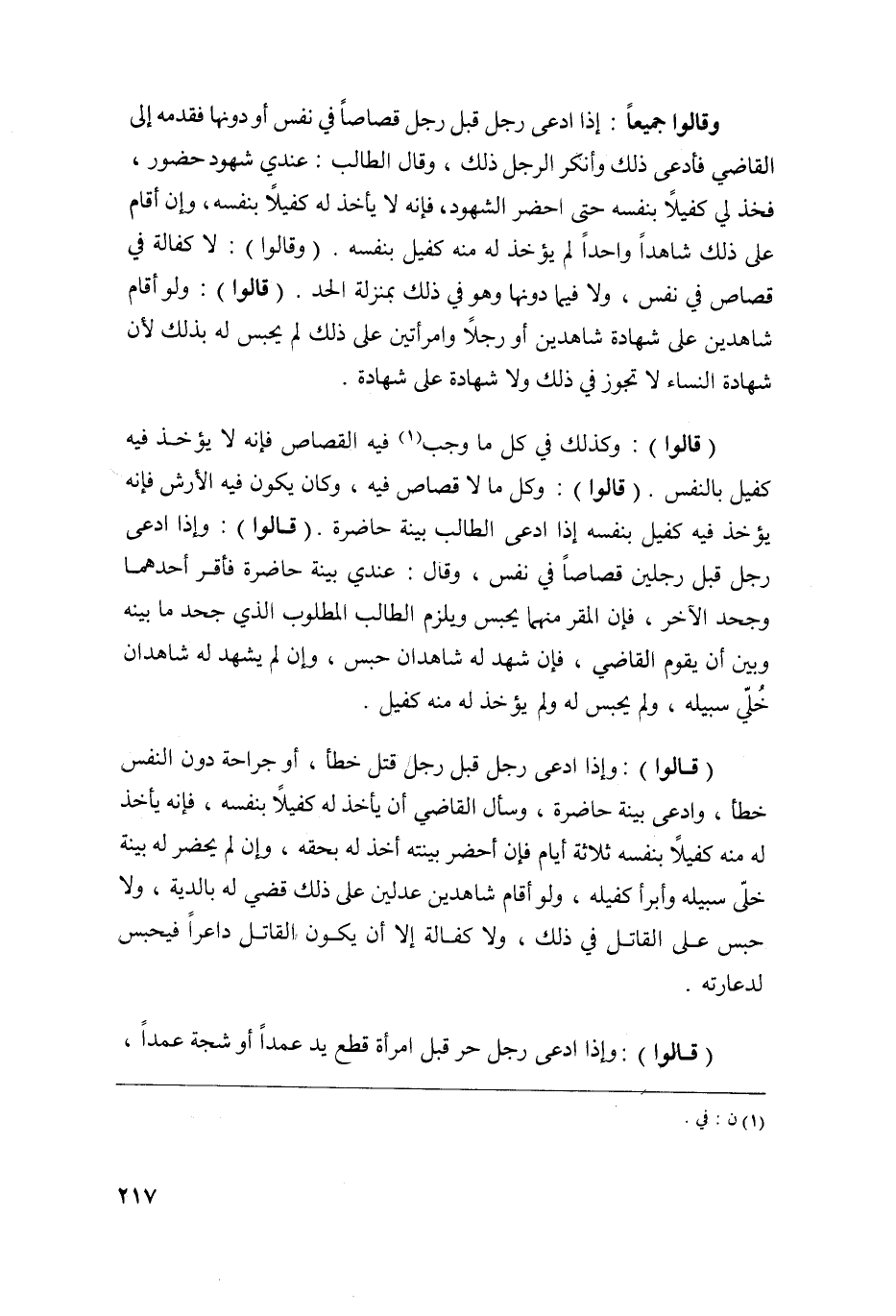 وقالوا جميعا إذا ادعى رجل قبل رجل قصاصا في نفس أو دونها فقدمه إلى القاضي فأدعى ذلك وأنكر الرجل ذلك وقال الطالب عندي شهود حضور فخذ لي كفيلا بنفسه حتى احضر الشهود فإنه لا يأخذ له كفيلا بنفسه وإن أقام على ذلك شاهدا واحدا لم يؤخذ له منه كفيل بنفسه وقالوا لا كفالة في قصاص في نفس ولا فيما دونها وهو في ذلك بمنزلة الحد قالوا ولو أقام شاهدين على شهادة شاهدين أو رجلا وامرأتين على ذلك لم يحبس له بذلك لأن شهادة النساء لا تجوز في ذلك ولا شهادة على شهادة.