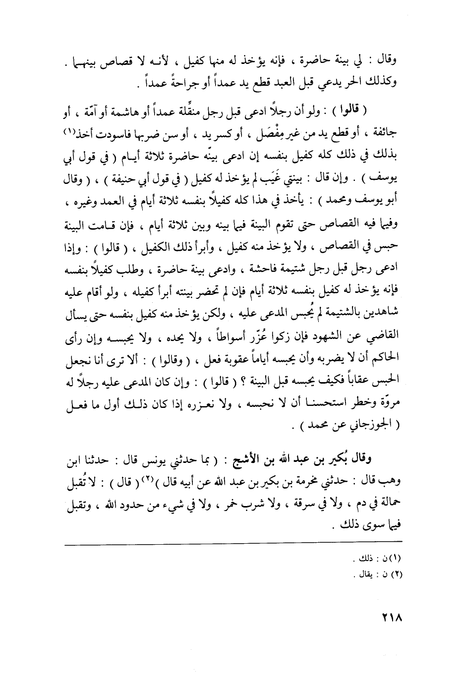 قالوا ولو أن رجلا ادعى قبل رجل منقلة عمدا أو هاشمة أو آمة أو جائفة أو قطع يد من غير مفصل أو كسر يد أو سن ضربها فاسودت أخذ1 بذلك في ذلك كله كفيل بنفسه إن ادعى بينه حاضرة ثلاثة أيام في قول أبي يوسف وإن قال بينتي غيب لم يؤخذ له كفيل في قول أبي حنيفة وقال أبو يوسف ومحمد يأخذ في هذا كله كفيلا بنفسه ثلاثة أيام في العمد وغيره وفيما فيه القصاص حتى تقوم البينة فيما بينه وبين ثلاثة أيام فإن قامت البينة حبس في القصاص ولا يؤخذ منه كفيل وأبرأ ذلك الكفيل قالوا وإذا ادعى رجل قبل رجل شتيمة فاحشة وادعى بينة حاضرة وطلب كفيلا بنفسه فإنه يؤخذ له كفيل بنفسه ثلاثة أيام فإن لم تحضر بينته أبرأ كفيله ولو أقام عليه شاهدين بالشتيمة لم يحبس المدعى عليه ولكن يؤخذ منه كفيل بنفسه حتى يسأل القاضي عن الشهود فإن زكوا عزر أسواطا ولا يحده ولا يحبسه وإن رأى الحاكم أن لا يضربه وأن يحبسه أياما عقوبة فعل وقالوا ألا ترى أنا نجعل الحبس عقابا فكيف يحبسه قبل البينة قالوا وإن كان المدعى عليه رجلا له مروة وخطر اسحتسنا أن لا نحبسه ولا نعزره إذا كان ذلك أول ما فعل الجوزجاني عن محمد.