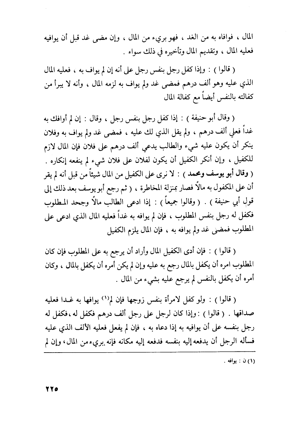 قالوا وإذا كفل رجل بنفس رجل على أنه إن لم يواف به فعليه المال الذي عليه وهو ألف درهم فمضى غد ولم يواف به لزمه المال وأنه لا يبرأ من كفالته بالنفس أيضا مع كفالة المال.