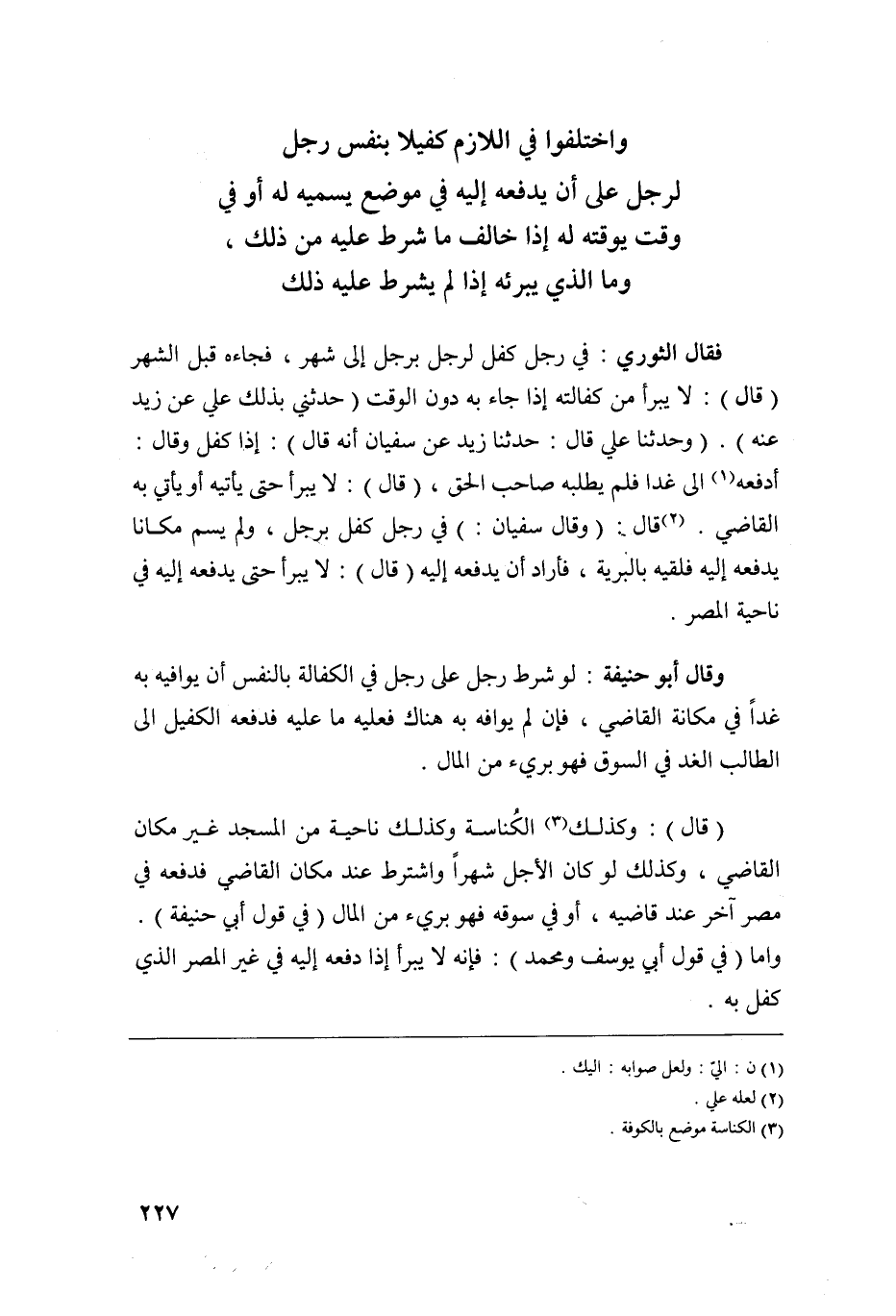 فقال الثوري في رجل كفل لرجل برجل إلى شهر فجاءه قبل الشهر قال لا يبرأ من كفالته إذا جاء به دون الوقت "حدثني بذلك علي عن زيد عنه" و"حدثنا علي قال حدثنا زيد عن سفيان أنه قال" إذا كفل وقال أدفعه1 إلى غدا فلم يطلبه صاحب الحق قال لا يبرأ حتى يأيته أو يأتي به القاضي. 2قال وقال سفيان في رجل كفل برجل ولم يسم مكانا يدفعه إليه فلقيه بالبرية فأراد أن يدفعه إليه قال لا يبرأ حتى يدفعه إليه في ناحية المصر.