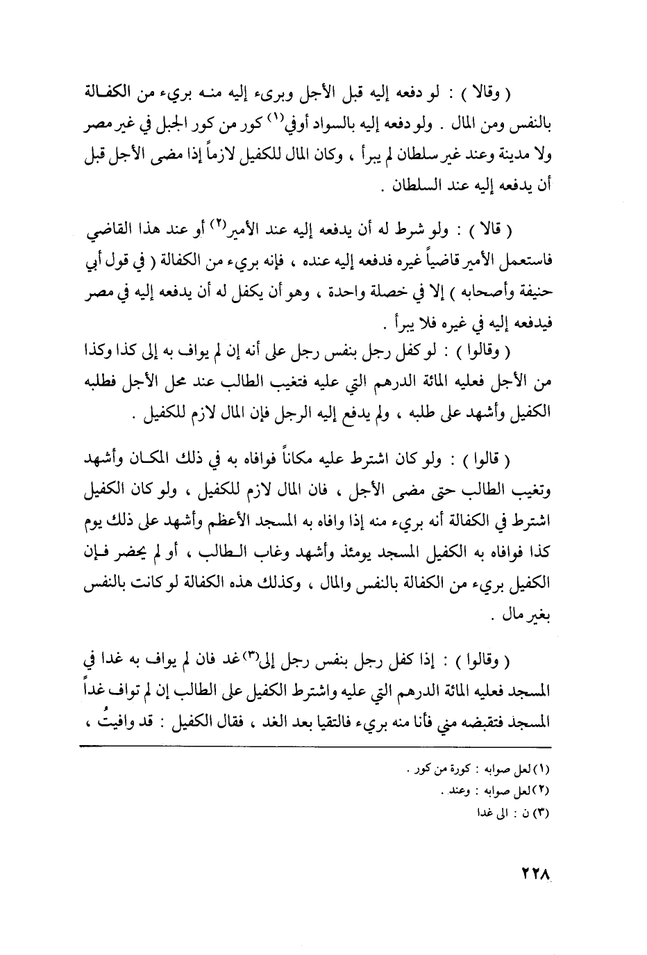 وقالا لو دفعه إليه قبل الأجل وبرئ إليه منه بريء من الكفالة بالنفس ومن المال ولو دفعه إليه بالسواد أو في1 كور من كور الجبل في غير مصر ولا مدينة وعند غير سلطان لم يبرأ وكان المال للكفيل لازما إذا مضى الأجل قبل أن يدفعه إليه عند السلطان.
