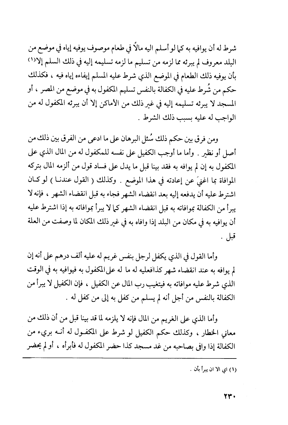 شرط له أن يوافيه به كما لو أسلم إليه مالا في طعام موصوف يوفيه إياه في موضع من البلد معروف لم يبرئه مما لزمه من تسليم ما لزمه تسليمه إليه في ذلك السلم إلا1 بأن يوفيه ذلك الطعام في الموضع الذي شرط عليه المسلم إيفاءه إياه فيه فكذلك حكم من شرط عليه في الكفالة بالنفس تسليم المكفول به في موضع من المصر أو المسجد لا يبرئه تسليمه إليه في غير ذلك من الأماكن إلا أن يبرئه المكفول له من الواجب له عليه بسبب ذلك الشرط.