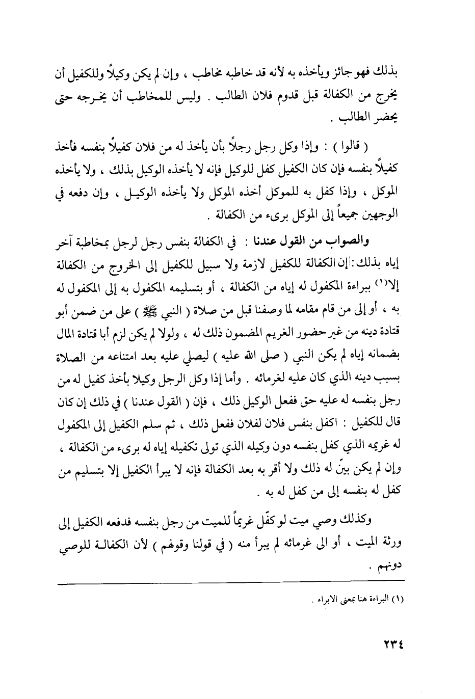 والصواب من القول عندنا: في الكفالة بنفس رجل لرجل بمخاطبة آخر إياه بذلك إن الكفالة للكفيل لازمة ولا سبيل للكفيل إلى الخروج من الكفالة إلا1 ببراءة المكفول له إياه من الكفالة أو بتسليمه المكفول به إلى المكفول له به أو إلى من قام مقامه لما وصفنا قبل من صلاة النبي صلي الله عليه وسلم على من ضمن أبو قتادة دينه من غير حضور الغريم المضمون ذلك له ولولا لم يكن لزم أبا قتادة المال بضمانه إياه لم يكن النبي صلي الله عليه وسلم ليصلي عليه بعد امتناعه من الصلاة بسبب دينه الذي كان عليه لغرمائه وأما إذا وكل الرجل وكيلا بأخذ كفيل له من رجل بنفسه له عليه حق ففعل الوكيل ذلك فإن القول عندنا في ذلك إن كان قال للكفيل اكفل بنفس فلان لفلان ففعل ذلك ثم سلم الكفيل إلى المكفول له غريمه الذي كفل بنفسه دون وكيله الذي تولى تكفيله إياه له برئ من الكفالة وإن لم يكن بين له ذلك ولا أقر به بعد الكفالة فإنه لا يبرأ الكفيل إلا بتسليم من كفل له بنفسه إلى من كفل له به.