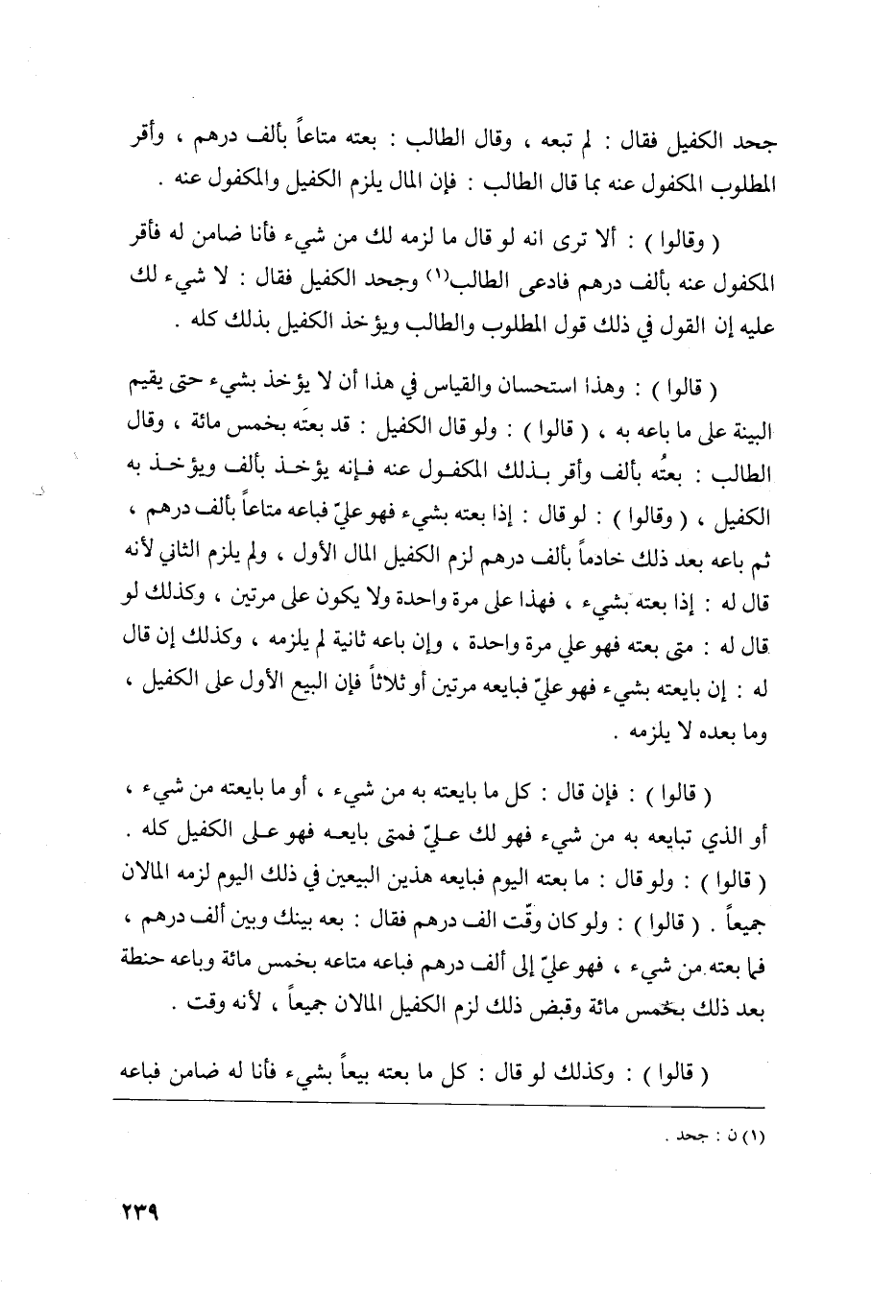 قالوا فإن قال كل ما بايعته به من شيء أو ما بايعته من شيء أو الذي تبايعه به من شيء فهو لك علي فمتى بايعه فهو على الكفيل كله قالوا ولو قال ما بعته اليوم فبايعه هذين البيعين في ذلك اليوم لزمه المالان جميعا قالوا ولو كان وقت ألف درهم فقال بعه بينك وبين ألف درهم فما بعته من شيء فهو علي إلي ألف درهم فباعه متاعه بخمس مائة وباعه حنطة بعد ذلك بخمس مائة وقبض ذلك لزم الكفيل المالان جميعا لأنه وقت.