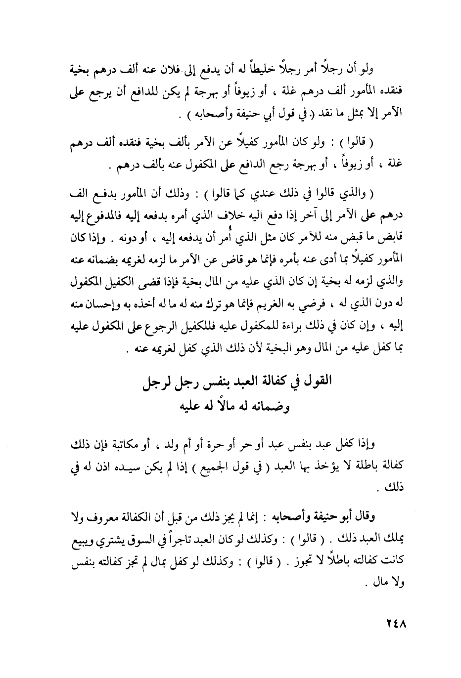 قالوا ولو كان المأمور كفيلا عن الآمر بألف بخية فنقده ألف درهم غلة أو زيوفا أو بهرجة رجع الدافع على المكفول عنه بألف درهم.