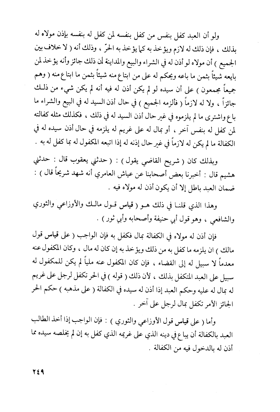 وأما على قياس قول الأوزاعي والثوري فإن الواجب إذا أخذ الطالب العبد بالكفالة أن يباع في دينه الذي على غريمه الذي كفل به إن لم يخلصه سيده مما أذن له بالدخول فيه من الكفالة.