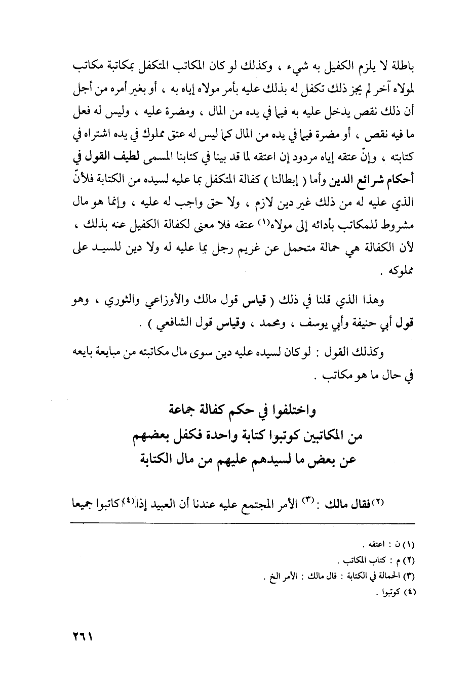 واختلفوا في حكم كفالة جماعة من المكاتبين كوتبوا كتابة واحدة فكفل بعضهم عن بعض ما لسيدهم عليهم من مال الكتابة