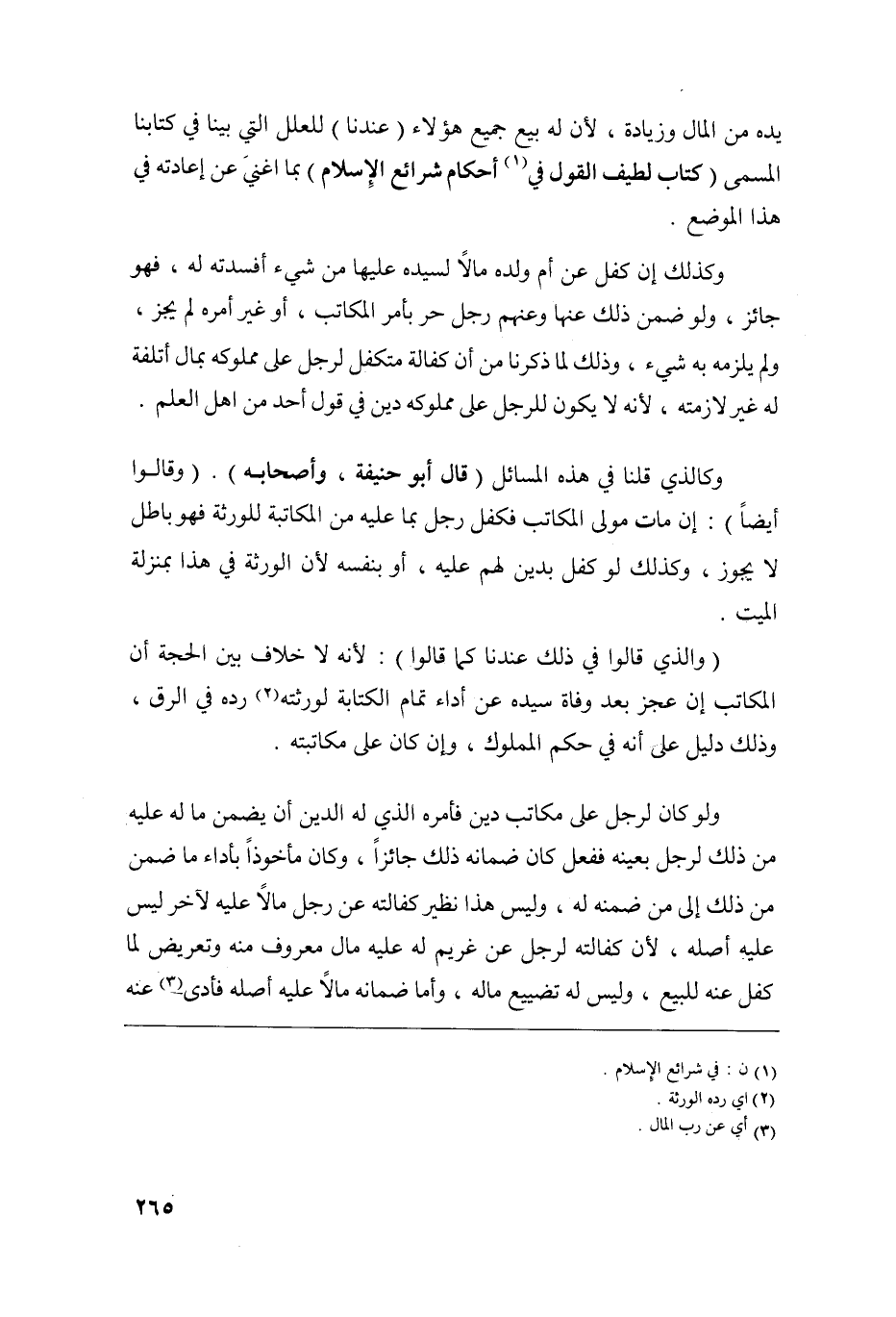 يده من المال وزيادة لأن له بيع جميع هؤلاء عندنا للعلل التي بينا في كتابنا المسمى كتاب لطيف القول في1 أحكام شرائع الإسلام بما اغني عن إعادته في هذا الموضع.