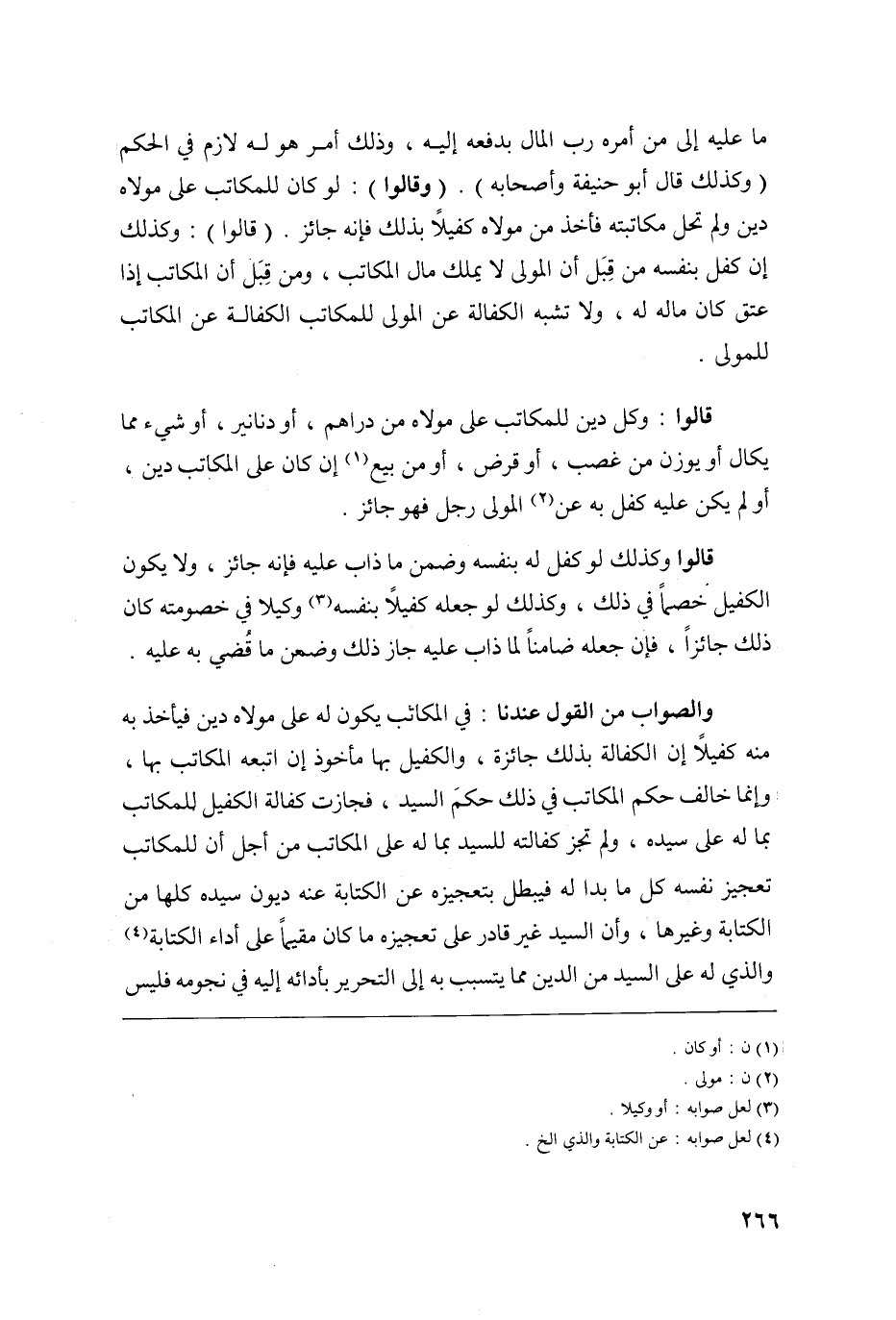 والصواب من القول عندنا في المكاتب يكون له على مولاه دين فيأخذ به منه كفيلا إن الكفالة بذلك جائزة والكفيل بها مأخوذ إن اتبعه المكاتب بها وإنما خالف حكم المكاتب في ذلك حكم السيد فجازت كفالة الكفيل للمكاتب بما له على سيده ولم تجز كفالته للسيد بما له على المكاتب من أجل أن للمكاتب تعجيز نفسه كل ما بدا له فيبطل بتعجيزه عن الكتابة عنه ديون سيده كلها من الكتابة وغيرها وأن السيد غير قادر على تعجيزه ما كان مقيما على أداء الكتابة4 والذي له على السيد من الدين مما يتسبب به إلى التحرير بأدائه إليه في نجومه فليس