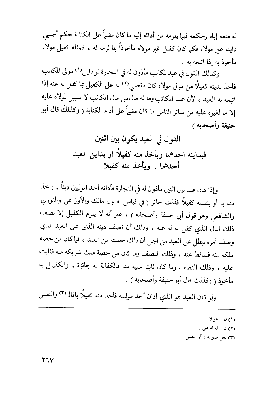 ولو كان العبد هو الذي أدان أحد مولييه فأخذ منه كفيلا بالمال1 والنفس