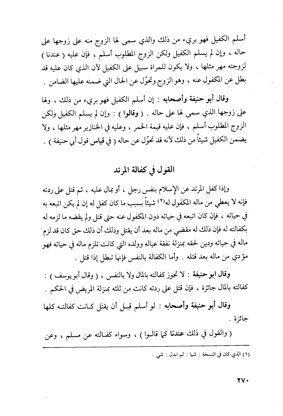 وقال أبو حنيفة وأصحابه لو أسلم قبل أن يقتل كانت كفالته كلها جائزة.