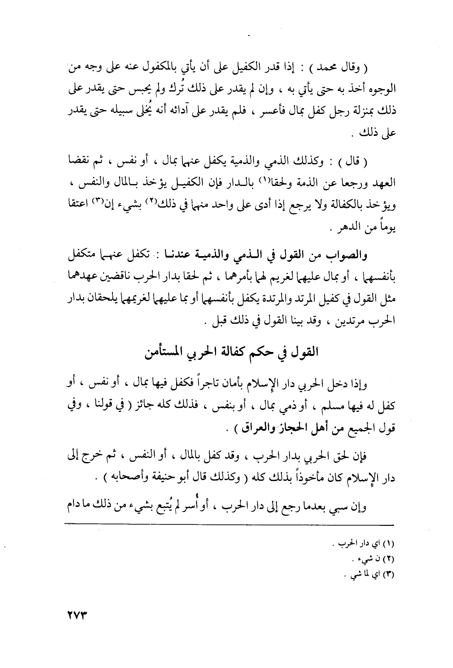 وإذا دخل الحربي دار الإسلام بأمان تاجرا فكفل فيها بمال أو نفس أو كفل له فيها مسلم أو ذمي بمال أو بنفس فذلك كله جائز في قولنا وفي قول الجميع من أهل الحجاز والعراق.
