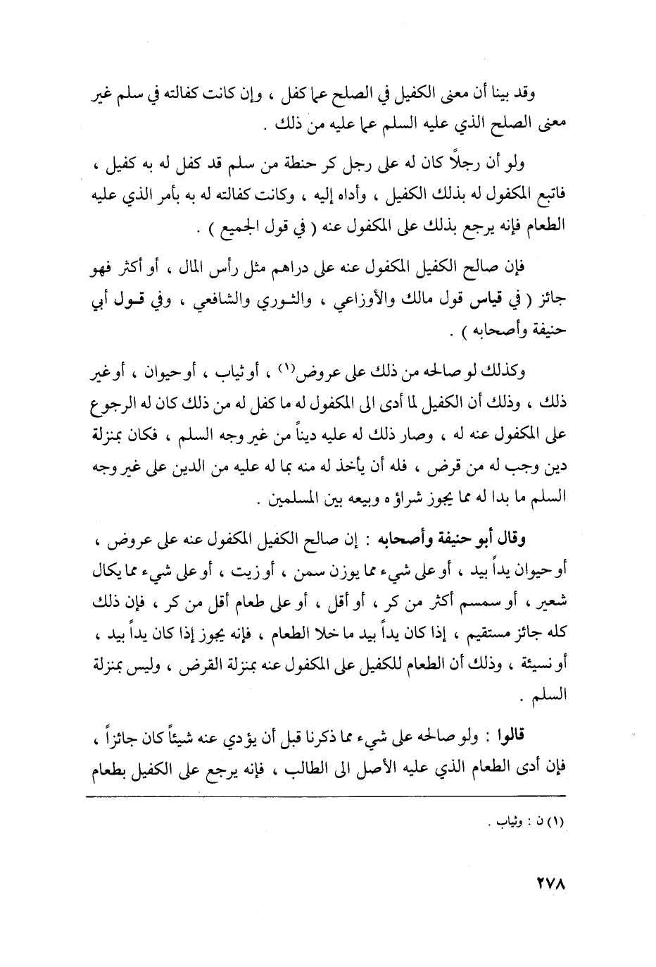 وقال أبو حنيفة وأصحابه إن صالح الكفيل المكفول عنه على عروض أو حيوان يدا بيد أو على شيء مما يوزن سمن أو زيت أو على شيء مما يكال شعير أو سمسم أكثر من كر أو أقل أو على طعام أقل من كر فإن ذلك كله جائز مستقيم إذا كان يدا بيد ما خلا الطعام فإنه يجوز إذا كان يدا بيد أو نسيئة وذلك أن الطعام للكفيل على المكفول عنه بمنزلة القرض وليس بمنزلة السلم.