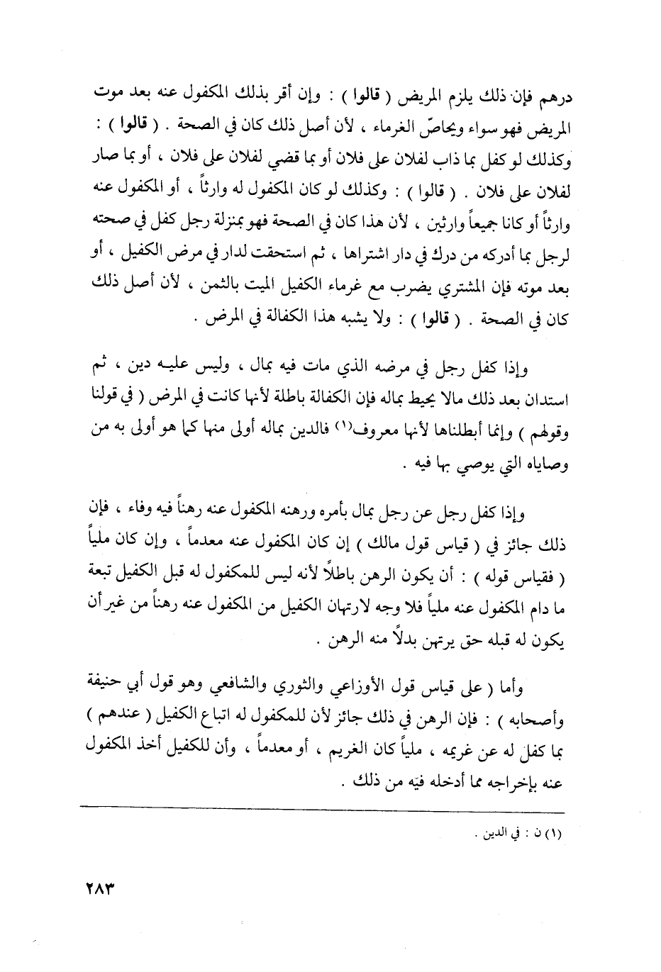 درهم فإن ذلك يلزم المريض قالوا وإن أقر بذلك المكفول عنه بعد موت المريض فهو سواء ويحاص الغرماء لأن أصل ذلك كان في الصحة قالوا وكذلك لو كفل بما ذاب لفلان على فلان أو بما قضي لفلان على فلان أو بما صار لفلان على فلان قالوا وكذلك لو كان المكفول له وارثا أو المكفول عنه وارثا أو كانا جميعا وارثين لأن هذا كان في الصحة فهو بمنزلة رجل كفل في صحته لرجل بما أدركه من درك في دار اشتراها ثم استحقت لدار في مرض الكفيل أو بعد موته فإن المشتري يضرب مع غرماء الكفيل الميت بالثمن لأن أصل ذلك كان في الصحة قالوا ولا يشبه هذا الكفالة في المرض.