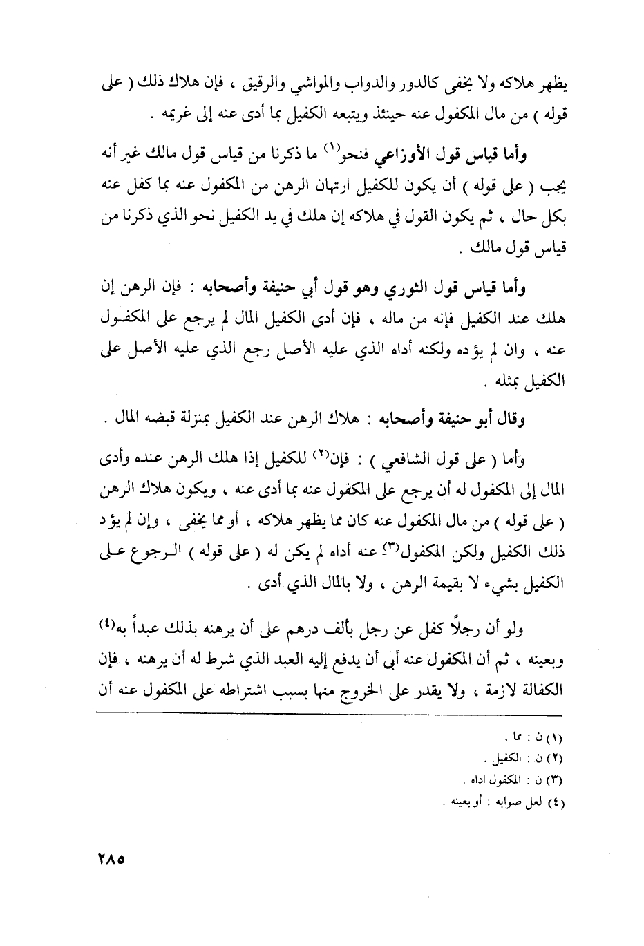وأما قياس قول الأوزاعي فنحو1 ما ذكرنا من قياس قول مالك غير أنه يجب على قوله أن يكون للكفيل ارتهان الرهن من المكفول عنه بما كفل عنه بكل حال ثم يكون القول في هلاكه إن هلك في يد الكفيل نحو الذي ذكرنا من قياس قول مالك.
