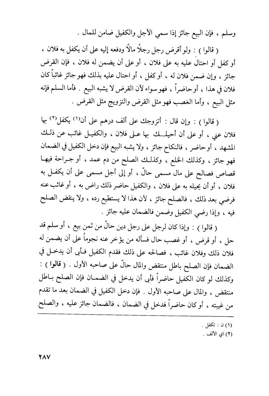قالوا وإن قال أتزوجك على ألف درهم على أن1 يكفل2 بها فلان عني أو على أن أحليك بها على فلان والكفيل غائب عن ذلك المشهد أو حاضر فالنكاح جائز ولا يشبه البيع فإن دخل الكفيل في الضمان فهو جائز وكذلك الخلع وكذلك الصلح من دم عمد أو جراحة فيها قصاص فصالح على مال مسمى حال أو إلى أجل مسمى على أن يكفل به فلان أو أن يحيله به على فلان والكفيل حاضر ذلك راض به أو غائب عنه فرضي بعد ذلك فالصلح فالصلح جائز لأن هذا لا يستطيع رده ولا ينقض الصلح فيه وإذا رضي الكفيل وضمن فالضمان عليه جائز.