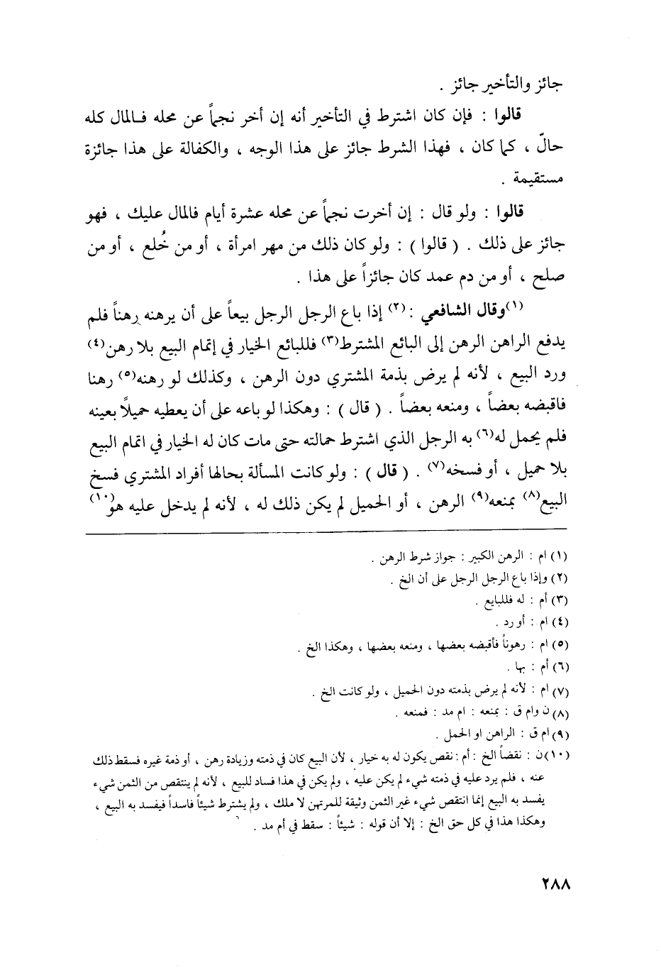 10 ن: نقضا الخ: أم: يكون له به خيار لأن البيع كان في ذمته أم ذمة غيره فسقط ذلك عنه فلم يرد عليه في ذمته شئ لم يكن عليه ولم يكن في هذا فساد للبيع لأنه لم ينتقص من الثمن شئ يفسد به البع إنما انتقص شئ غير الثمن وثيقة للمرتهن لا ملك ولم يشترط شيئا فاسد به البيع وهكذا هذا في كل حق الخ: إلا أن قوله: شيئا: سقط في أم مد.