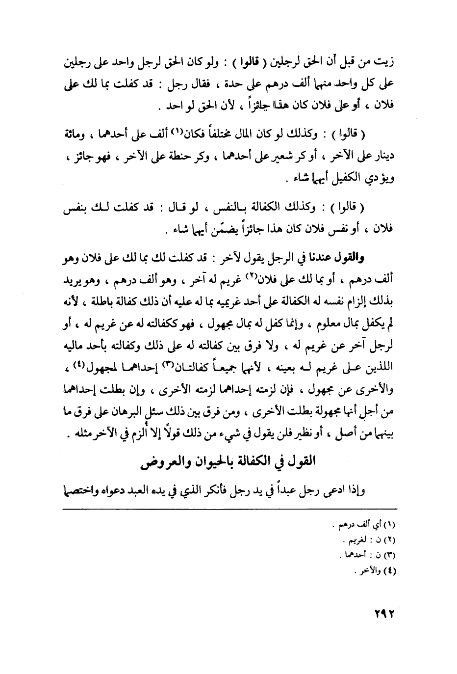 قالوا وكذلك لو كان المال مختلفا فكان1 ألف على أحدهما ومائة دينار على الآخر أو كر شعير على أحدهما وكر حنطة على الآخر فهو جائز ويؤدي الكفيل أيهما شاء.