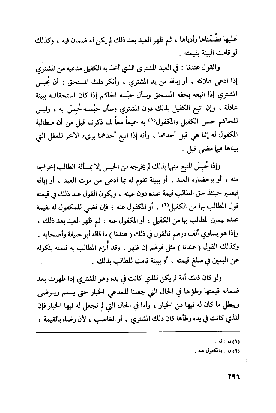 وإذا حبس المتبع منهما بذلك لم يخرجه من الحبس إلا بمسألة الطالب إخراجه منه أو بإحضاره العبد أو ببينة تقوم له بما ادعى من موت العبد أو إباقه فيصير حينئذ حق الطالب قيمة عبده دون عينه ويكون القول عند ذلك في قيمته قول المطالب بها من الكفيل2 أو المكفول عنه فإن قضي للمكفول له بقيمة عبده بيمين المطالب بها من الكفيل أو المكفول عنه ثم ظهر العبد بعد ذلك وإذا هو يساوي ألف درهم فالقول في ذلك عندنا ما قاله أبو حنيفة وأصحابه وكذلك القول عندنا مثل قولهم إن ظهر وقد ألزم المطالب يه قيمته بنكوله عن اليمين في مبلغ قيمته أو ببينة قامت للطالب بذلك.