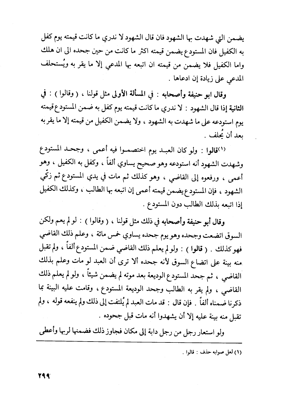1قالوا ولو كان العبد يوم اختصموا فيه أعمى وجحد المستودع وشهدت الشهود أنه استودعه وهو صحيح يساوي ألفا وكفل به الكفيل وهو أعمى ورفعوه إلى القاضي وهو كذلك ثم مات في يدي المستودع ثم زكي الشهود فإن المستودع يضمن قيمته أعمى إن اتبعه بها الطالب وكذلك الكفيل إذا اتبعه بذلك الطالب دون المستودع.