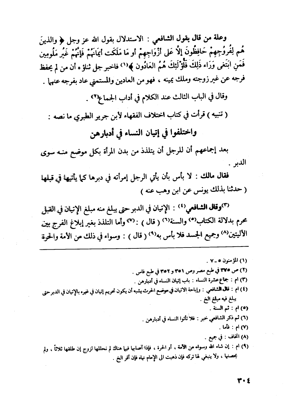 2 أم: قال الشافعي: وإباحة الإتيان في موضع الحرث يشبه أن يكون تحريم في غيره بالإتيان في الدبر حتي يبلغ فيه مبلغ الخ.