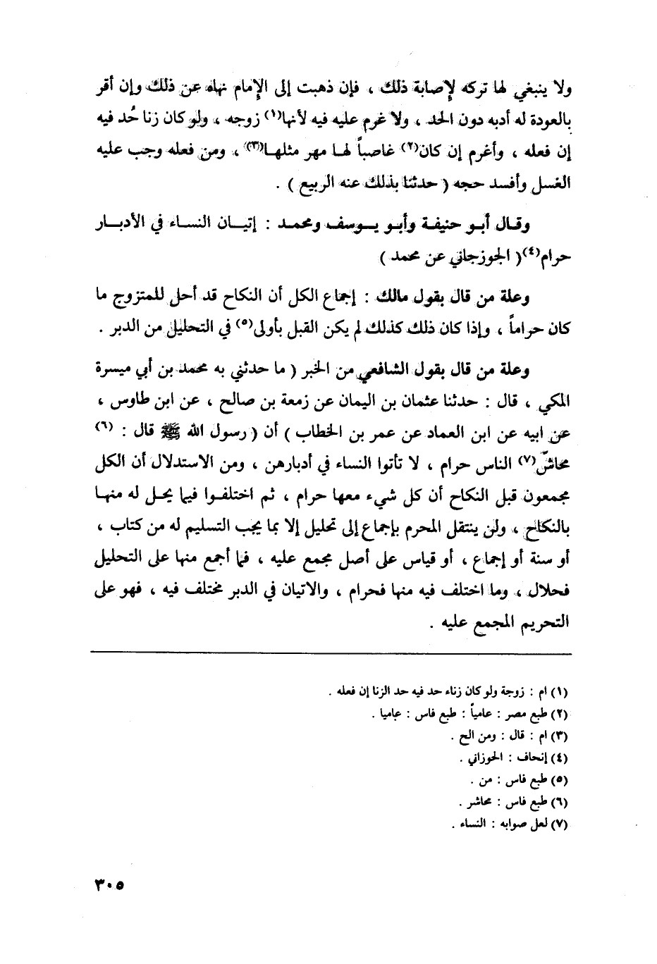 وعلة من قال بقول الشافعي من الخبر ما "حدثني به محمد بن أبي ميسرة المكي قال حدثنا عثمان بن اليمان عن زمعة بن صالح عن ابن طاوس عن ابيه عن ابن العماد عن عمر بن الخطاب" أن رسول الله صلي الله عليه وسلم قال:6 "محاش7 الناس حرام لا تأتوا النساء في أدبارهن" ومن الاستدلال أن الكل مجمعون قبل النكاح أن كل شيء معها حرام ثم اختلفوا فيما يحل له منها بالنكاح ولن ينتقل المحرم بإجماع إلى تحليل إلا بما يجب التسليم له من كتاب أو سنة أو إجماع أو قياس على أصل مجمع عليه فما أجمع منها على التحليل فحلال وما اختلف فيه منها فحرام والإتيان في الدبر مختلف فيه فهو على التحريم المجمع عليه: