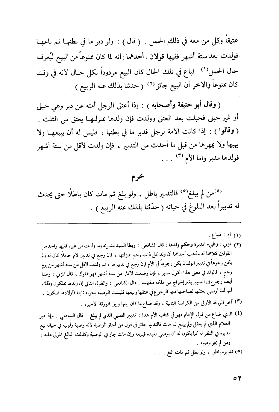 عتيقا وكل من معه في ذلك الحمل قال ولو دبر ما في بطنها ثم باعها فولدت بعد ستة أشهر ففيها قولان أحدهما أنه لما كان ممنوعا من البيع ليعرف حال الحمل1 فباع في تلك الحال كان البيع مردودا بكل حال لأنه في وقت كان ممنوعا والاخر أن البيع جائز2 "حدثنا بذلك عنه الربيع".