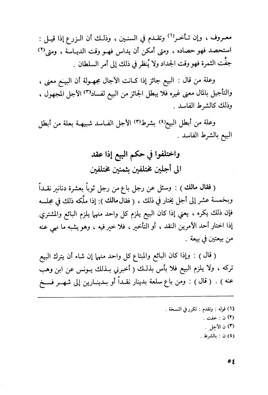 وعلة من قال البيع جائز إذا كانت الآجال مجهولة أن البيع معنى والتأجيل بالمال معنى غيره فلا يبطل الجائز من البيع لفساد3 الأجل المجهول وذلك كالشرط الفاسد.