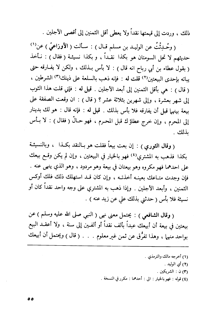 وقال الشافعي يحتمل معنى "نهى النبي صلي الله عليه وسلم عن بيعتين في بيعة" أن أبيعك عبدا بألف نقدا أو ألفين إلى سنة ولا أعقد البيع بواحد منهما وهذا تفرق عن ثمن غير معلوم قال ويحتمل أن أبيعك